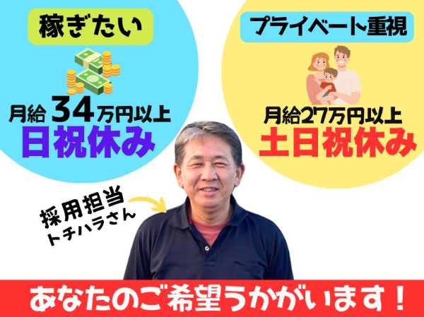 | 休日 | 年間休日120日以上可 完全週休2日制可(土日祝日休み) ・夏季休暇 ・冬期休暇 ・GW \高収入を希望する方は…/ 月収34万円以上稼げる! 土曜出勤をおすすめします! 年間休日数: 年間休日104日~120日 |